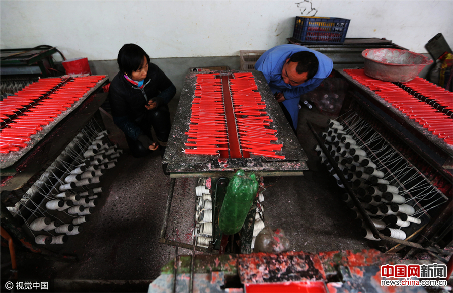 2017年1月11日,西安。西安市户县祖庵镇大庵村,这里的蜡烛远近闻名,多年前这里家家户户都会做蜡烛,好多以做蜡烛为生,也有很多靠做蜡烛发了财,由于现在电子时代的发展,蜡烛的销量远不如以前,这个村子现在维持下来做蜡烛的只有十来户人家,张亚飞和张亚兵兄弟俩就是其中一家做的比较好的。入秋以来是做蜡烛的旺季,一是腊月里喜事比较多,还有就是过年期间农村需求量还是比较大。