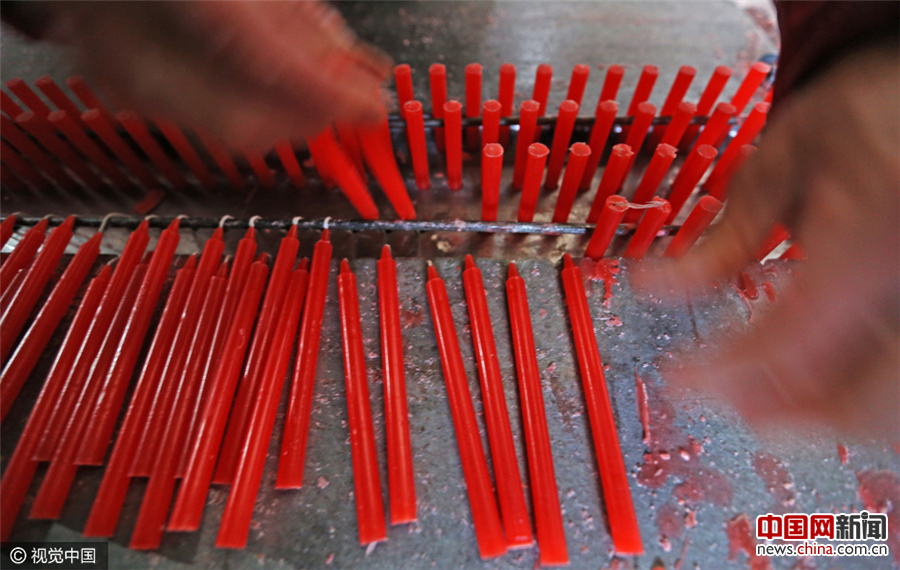 2017年1月11日,西安。西安市户县祖庵镇大庵村,这里的蜡烛远近闻名,多年前这里家家户户都会做蜡烛,好多以做蜡烛为生,也有很多靠做蜡烛发了财,由于现在电子时代的发展,蜡烛的销量远不如以前,这个村子现在维持下来做蜡烛的只有十来户人家,张亚飞和张亚兵兄弟俩就是其中一家做的比较好的。入秋以来是做蜡烛的旺季,一是腊月里喜事比较多,还有就是过年期间农村需求量还是比较大。