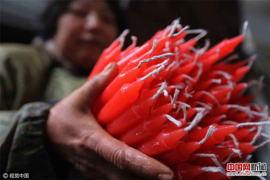 2017年1月11日,西安。西安市户县祖庵镇大庵村,这里的蜡烛远近闻名,多年前这里家家户户都会做蜡烛,好多以做蜡烛为生,也有很多靠做蜡烛发了财,由于现在电子时代的发展,蜡烛的销量远不如以前,这个村子现在维持下来做蜡烛的只有十来户人家,张亚飞和张亚兵兄弟俩就是其中一家做的比较好的。入秋以来是做蜡烛的旺季,一是腊月里喜事比较多,还有就是过年期间农村需求量还是比较大。