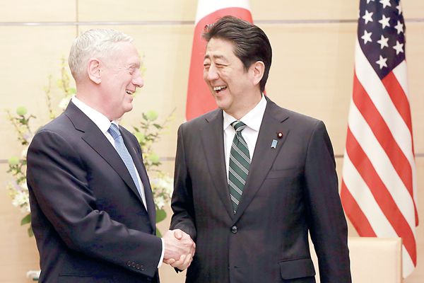 2月3日,日本首相安倍晋三会见来访的美国新防长马蒂斯。