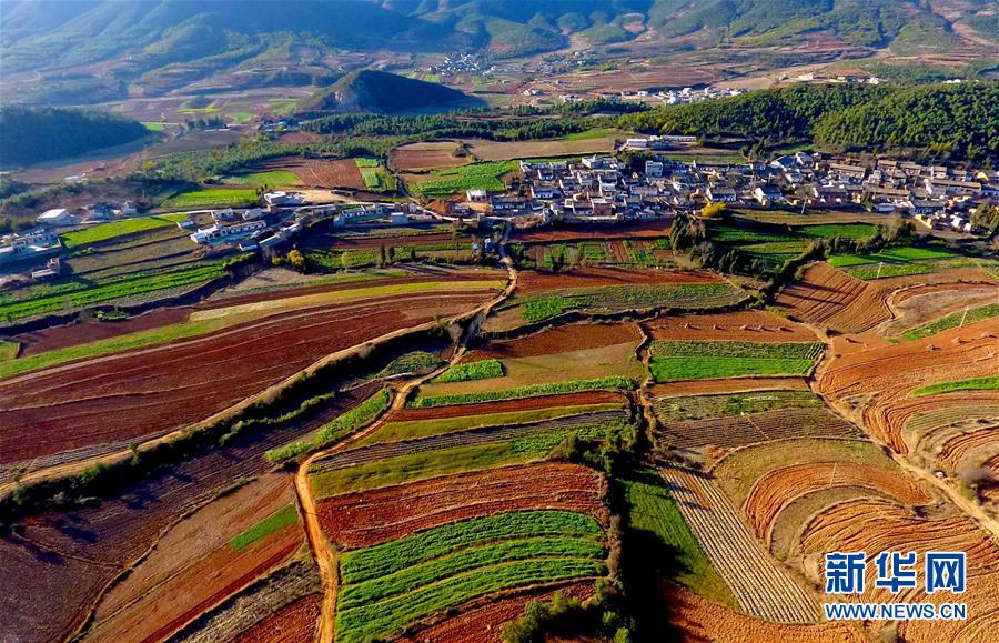 云南马龙县大庄乡石河村的秀美景色(2月4日摄)。俯瞰秀美的云南省曲靖市马龙县山乡,一栋栋农民新居拔地而起,即将播种的红土地线条流畅,明媚的春光下长势喜人的各种农作物和绿色生态植被,构成美丽的新农村诗画。新华社记者杨宗友摄