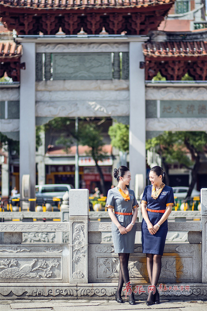 有人说,古桥是属于烟雨和油纸伞的,丁香一般的女子,撑着一把油纸伞,应该是水墨画一般的美景。但我们前往的一天,天气却出奇的晴朗。穿着优雅的空乘制服,融入古桥风景,黄色的砖石、青色的制服、碧色的海水、翠色的绿植……调色师千方百计想要涂染的油画色彩便在此刻跃然于古桥上。晴天的古桥,没有烟雨的忧愁,却多了一份阳光带来的温暖和舒适。