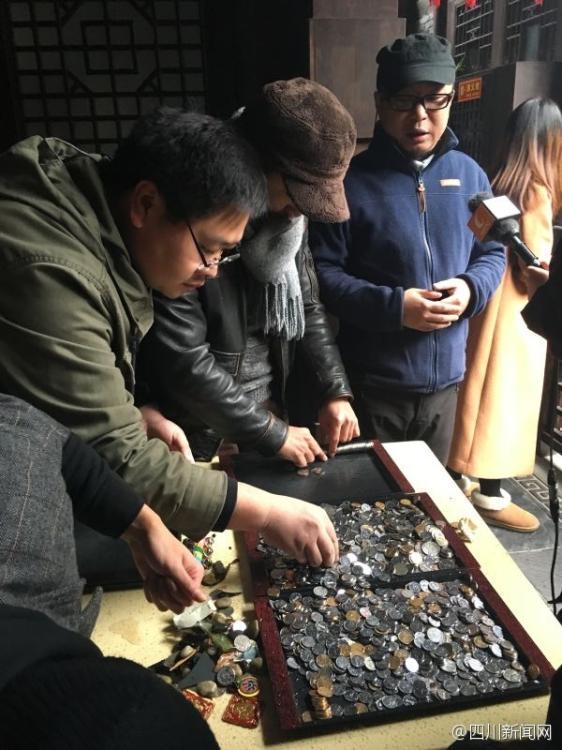成都宽窄巷硬币池捞钱 满桌硬币密密麻麻