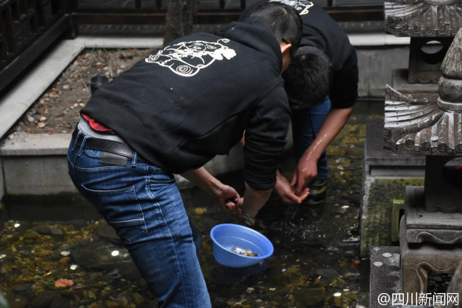 工作人员在“网红池”内捞钱。四川新闻网记者 漆奇 周子铭 雷兹 图片来源:四川新闻网官方微博
