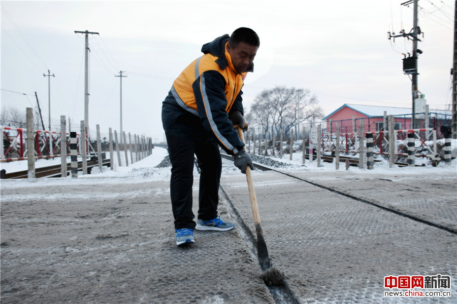 万伟军使用特制工具清理道口轮缘槽的积雪,保证列车安全通行。