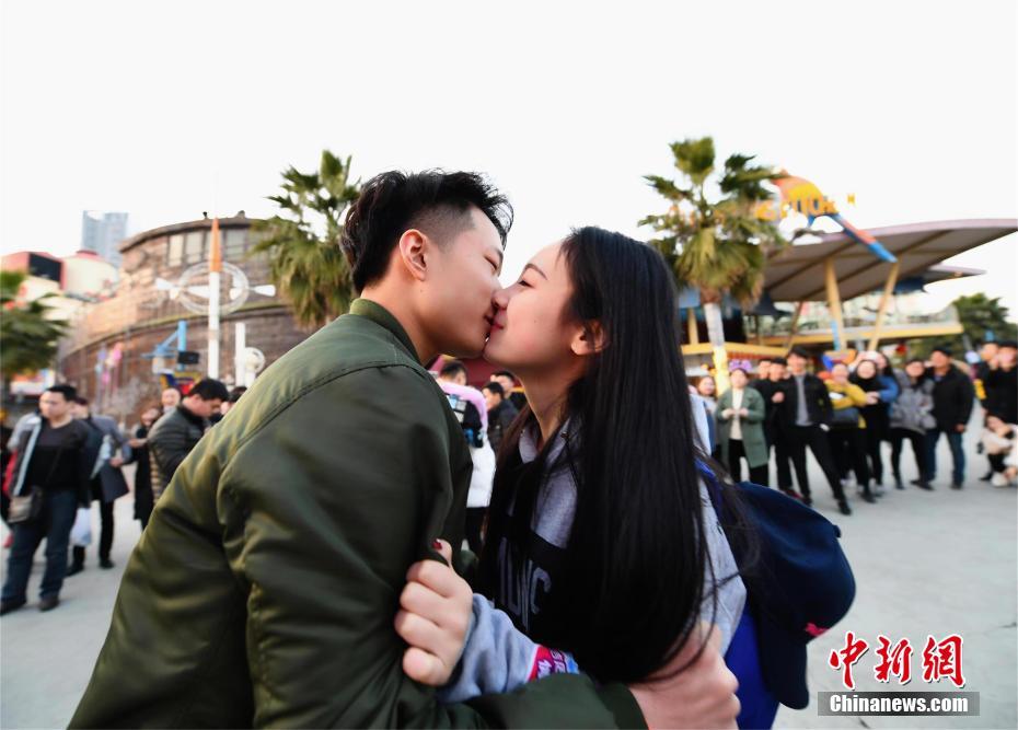 2月13日下午,武汉欢乐谷内,7对情侣参与“花式接吻”比赛。根据比赛规则,每对参赛情侣四只脚只能有两只脚着地,接吻时间持续最长者获胜。比赛过程中,接吻情侣间上演“对对碰”。最终,一对学生情侣击败其他参赛者获胜。张畅 摄