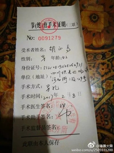 胡正高:警察说带走我老婆是为了解情况。我老婆被带走后,十几个人轮番跟我说,你这个事情,镇党委书记已经知道,说:“你必须要做这个手术,你不做,你老婆就是扰乱公共秩序罪,要拘留15天,你做了,我就跟派出所说说情。”我只能配合。