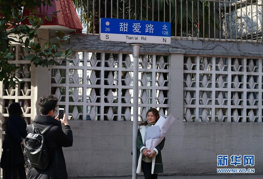 2月14日,一个女孩手捧男友送的鲜花在甜爱路路牌下留影。新华社记者刘颖 摄