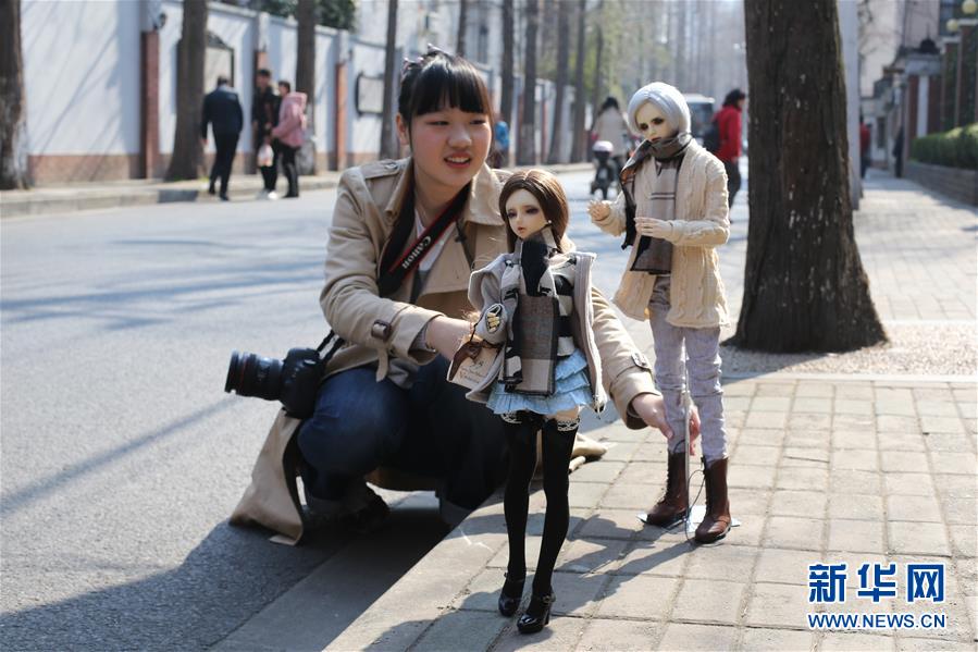 2月14日,一名动漫爱好者把自己喜欢的动漫人偶带到甜爱路拍“情人节纪念照”。新华社记者刘颖 摄