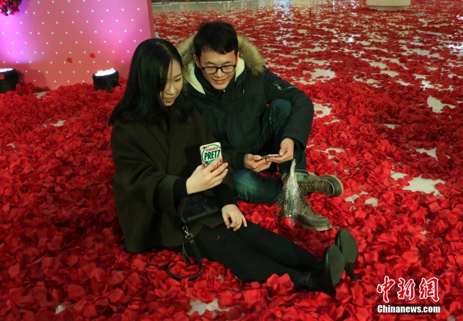 一对情侣在满地的仿真玫瑰花瓣中拍照。 王刚 摄