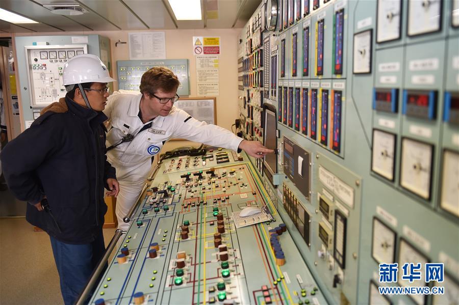 2月15日,“泰欧”号第一副船长(右)在操作室与宁波舟山港码头技术人员核对卸油作业的进度。 2月16日下午,世界在航的最大载重吨级别船舶(超巨型原油轮)“泰欧”号在首次停泊宁波舟山港大榭港区实华二期45万吨原油码头完成卸油后离泊。据了解,该轮船长380米,船宽68米,目前载重吨为41.9万吨。2月13日,装载33.96万吨原油的该船挂靠宁波舟山港大榭港区实华二期45万吨原油码头,创下挂靠宁波舟山港单艘油轮实际装载量最大的纪录。宁波舟山港大榭港区实华二期45万吨原油码头于2012年5月正式投产,为亚洲最大、中国首个正式投用的45万吨原油码头。新华社记者黄宗治 摄