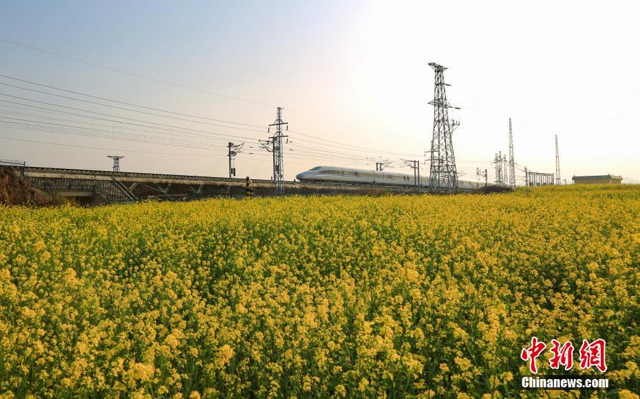 2月16日,一列沪昆高铁列车在贵州安顺境内的油菜花田前驶过。随着气温回升,沪昆高铁贵州省安顺市境内沿线的油菜花竞相绽放,处处春意盎然。中新社记者 贺俊怡 摄