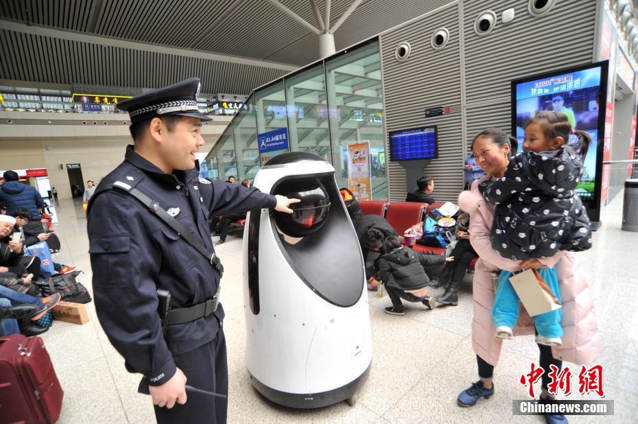 2017年2月17日,河南郑州,一款警察机器人在郑州东高铁站巡逻执勤。中新社发 宁坚 摄 图片来源:CNSPHOTO