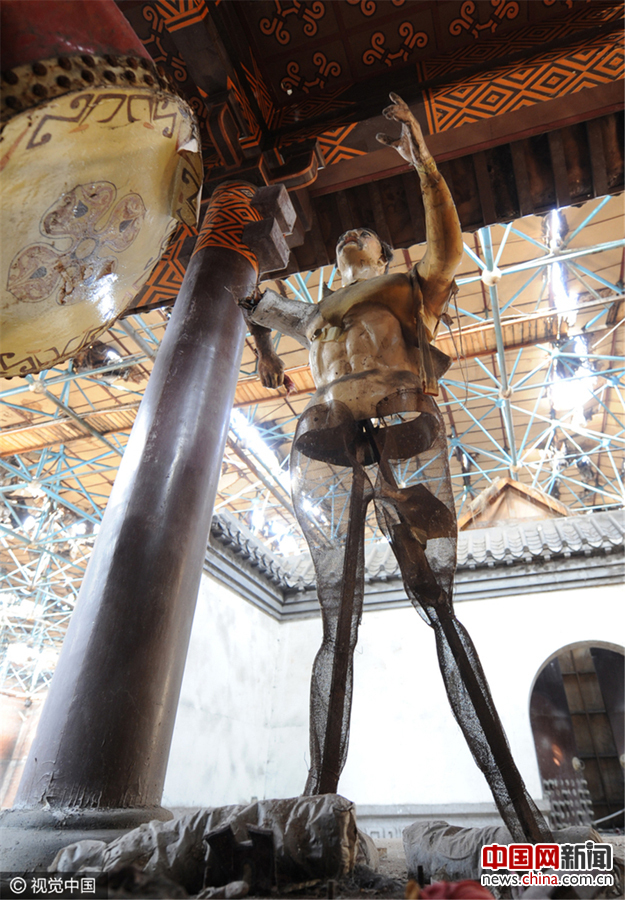 1995年,历时3年、耗资6000多万元,坐落在清徐县城西北清泉湖畔的三国城正式落成并向游人开放。其总体结构为仿明清皇宫式四周封闭合体建筑,其中关圣殿中的关羽座像,塑像之高大,就目前而言居全国之冠。开业初年,门票收入约300万元,此后开始直线下降。时光荏苒,弹指一挥二十多年,“三国城”却早已今非昔比。邓寅明/视觉中国