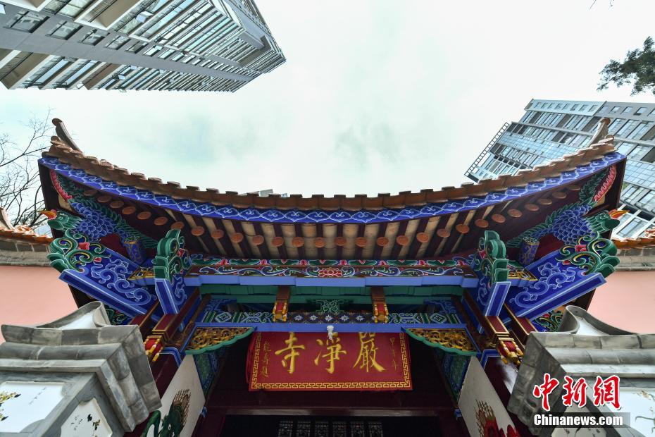 2月20日,昆明假日城市小区内有一个名为严净寺的寺庙,前往寺庙需要通过小区大门,寺庙被两旁的高层住宅团团包围,成为都市一景。中新社记者任东 摄