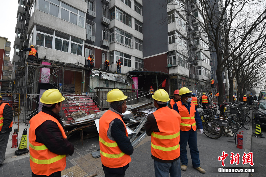 2月21日,北京市西城区白纸坊西街上,聚集了不少工程车和执法人员,随着对大清花饭店门前避风格的拆除,拉开了白纸坊地区2017年“开墙打洞”整治行动的序幕。据悉,由于历史原因,白纸坊西街南侧不少居民楼底墒形成了大量违法建设,白纸坊街道环境整治办统计,在500米左右长的街道上聚集了几十家存在“开墙打洞”行为的商户。预计到2017年9月前,白纸坊地区将集中整治周边10条大街的300多处“开墙打洞”等违法行为。中新网记者 金硕 摄