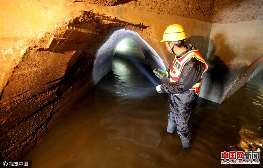 2017年2月23日,青岛。工作人员对仅存的德占时期5条排水系统在内的35条暗渠实施“一渠一档”精细化管理。1898年德国侵占青岛,开始进行城市排水管网建设,至1905年初具规模,以后逐渐向北延伸。其中,欧洲人居住区(中山路南段以东,自德县路过观象山、信号山至太平山一线以南至海边整个区域)及前海一带,采用雨污分流模式,雨水管、污水管分别设置;华人区(西镇和现市北区)则采用雨污合流模式,雨水、污水共享一管。据统计,现有2.66公里原有雨水暗渠保留原始风貌仍在使用,分别位于大学路、安徽路、中山路、江苏路、郯城路共5条德占时期修建的暗渠。何海儿/视觉中国