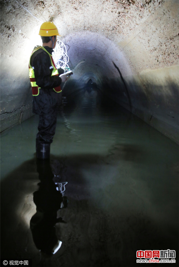 2017年2月23日,青岛。工作人员对仅存的德占时期5条排水系统在内的35条暗渠实施“一渠一档”精细化管理。1898年德国侵占青岛,开始进行城市排水管网建设,至1905年初具规模,以后逐渐向北延伸。其中,欧洲人居住区(中山路南段以东,自德县路过观象山、信号山至太平山一线以南至海边整个区域)及前海一带,采用雨污分流模式,雨水管、污水管分别设置;华人区(西镇和现市北区)则采用雨污合流模式,雨水、污水共享一管。据统计,现有2.66公里原有雨水暗渠保留原始风貌仍在使用,分别位于大学路、安徽路、中山路、江苏路、郯城路共5条德占时期修建的暗渠。何海儿/视觉中国