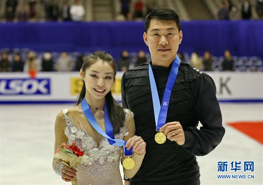 2月25日,中国队选手于小雨(左)/张昊领奖后展示金牌。当日,在第八届亚洲冬季运动会花样滑冰双人滑比赛中,中国选手于小雨/张昊以223.88分的总成绩夺得冠军,队友彭程/金杨以197.06分的总成绩获得亚军。新华社记者杨世尧摄