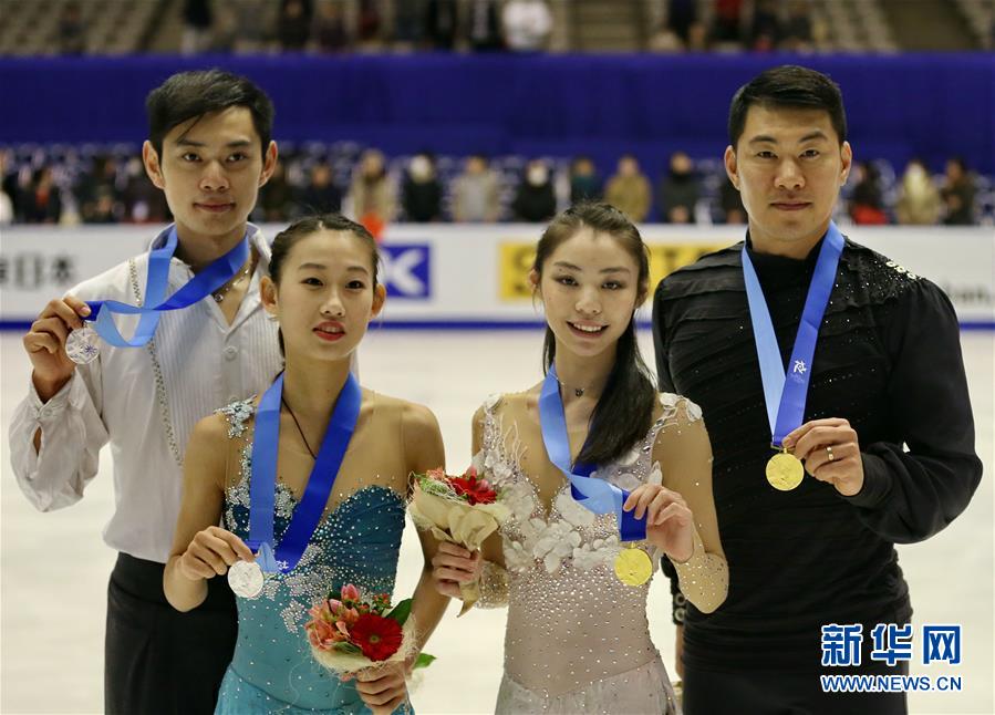2月25日,中国队选手于小雨(右二)/张昊(右一)与彭程(左二)/金杨(左一)在领奖后合影。当日,在第八届亚洲冬季运动会花样滑冰双人滑比赛中,中国选手于小雨/张昊以223.88分的总成绩夺得冠军,队友彭程/金杨以197.06分的总成绩获得亚军。新华社记者杨世尧摄
