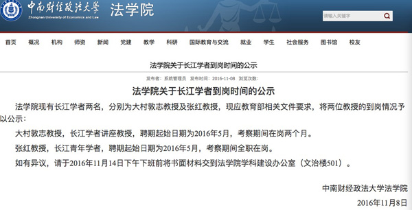 张红于2016年5月已是该校青年长江学者,考察期间全职在岗。据中南财经政法大学新闻网2012年一篇名为《青年教师张红博士入选武汉十大杰出青年》的报道,张红出生于1982年,2000年考入中南财经政法大学法学院,2006年获法学硕士学位,2009年获中国政法大学博士学位,2010年获德国奥斯纳布吕克大学博士学位后回中南财经政法大学投身教研。