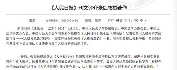 张红《人格权总论》一书于2014年1月获中国人民大学常务副校长王利明教授刊于《人民日报》第七版(理论版)的高度评价。新华网2013年12月也曾报道中南财经政法大学研究生院公示了2013年20名新增博士生导师名单,其中特别提及法学院张红教授为31岁,“如此年轻在人文社会科学领域颇为少见,被称 ‘娃娃’博导。”