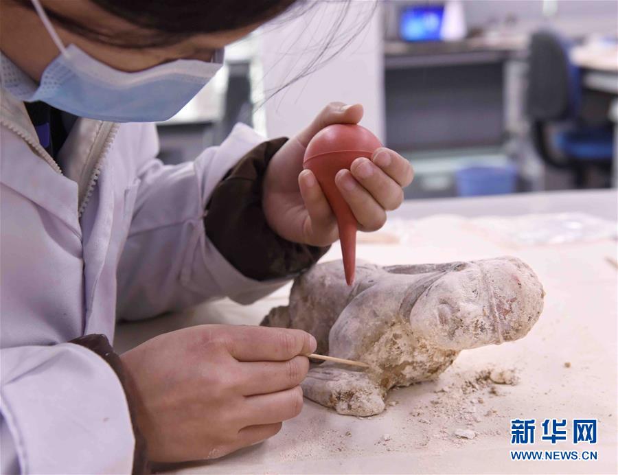 2月27日,成都考古研究所文物保护与修复中心工作人员在对出土的匍匐俑进行清理。