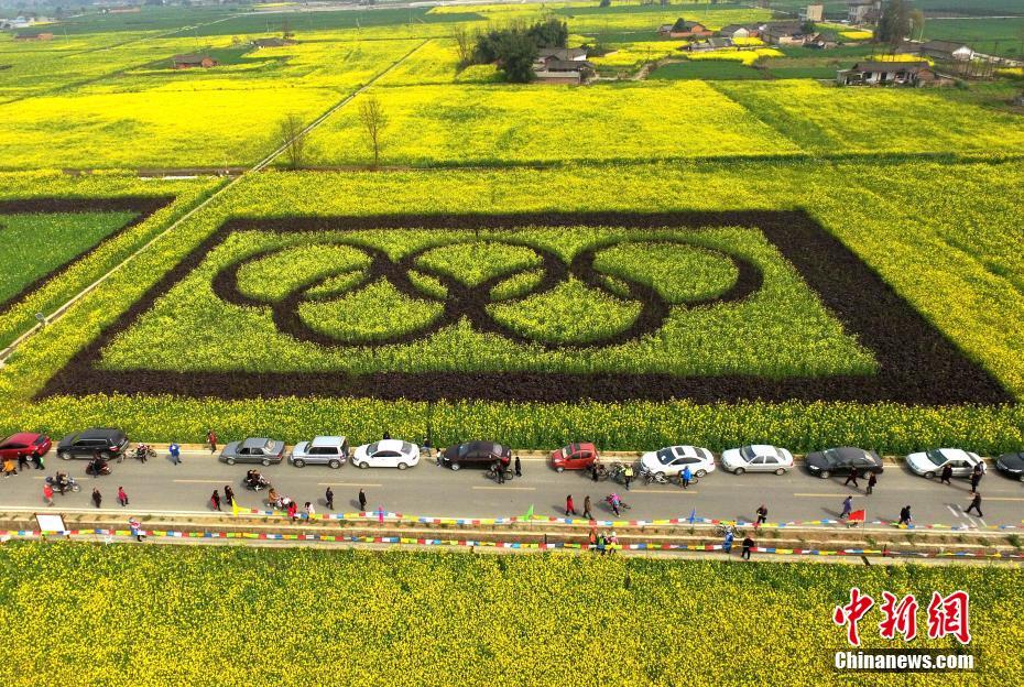 2月27日,四川邛崃,油菜田间的“奥运五环”图案。当日,四川邛崃冉义镇万亩油菜花海中惊现憨态可掬的熊猫兄弟、丘比特之箭、农耕扶犁等巨型创意图,从高空俯视一幅幅生动的大地景观,十分有趣。中新社记者刘忠俊 摄