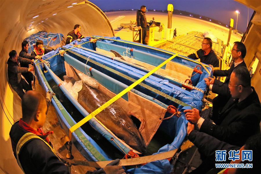 当日,一架载有10头宽吻海豚的货机从日本大阪飞抵山东烟台。在蓬莱国际机场经过检疫后,海豚平安抵达蓬莱海洋极地世界。这批海豚包括8头雌性,2头雄性,年龄在2-4岁之间,度过适应期后将与游客见面。新华社发(唐克 摄)