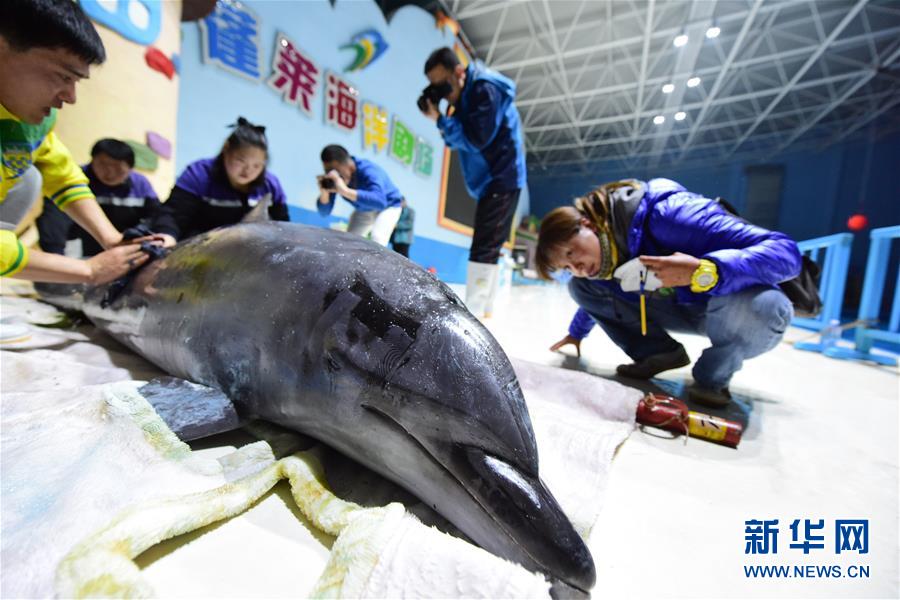2月27日,在山东蓬莱海洋极地世界,工作人员在观察海豚状态。