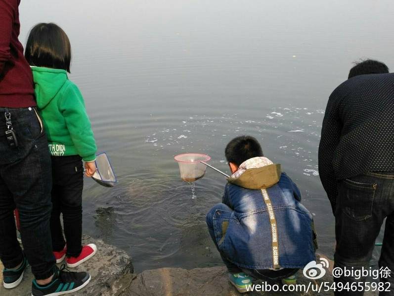市民不顾劝阻,抓刚放生的鱼。