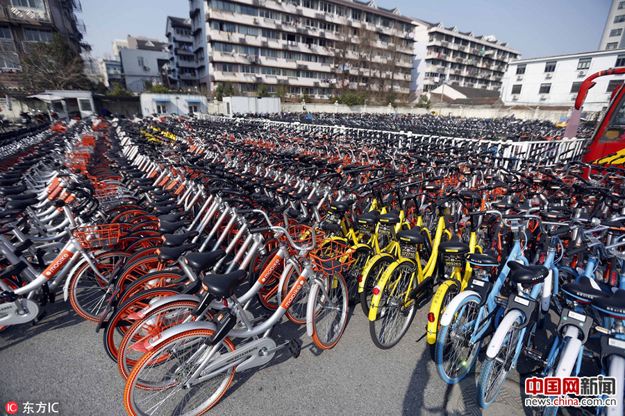 2017年2月28日,上海,共享单车的普及,方便了“最后一公里”出行,却也成为公共管理的“显微镜”和公共素质的“照妖镜”。用户在使用单车完毕后随处停放的陋习,破坏了城市秩序,也造成了单车运营和城市管理之间的矛盾。在上海市黄浦区车辆停放管理公司制造局路停车场,约4500辆共享单车被扣押在此。柏可林/东方IC
