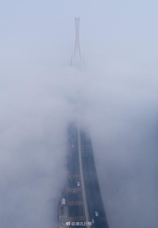 3月07日05时23分,武汉市气象台发布大雾橙色预警信号:武汉大部地区已经出现能见度小于200米、局部小于100米的雾,并将持续。图为武汉天兴洲大桥附近,高架桥被大雾遮挡,宛如天路。湖北日报记者柯皓 摄 图片来源:湖北日报官方微博
