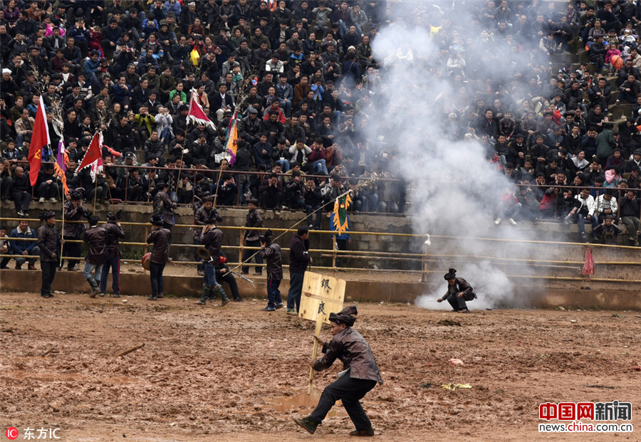 2017年3月11日,贵州省江县下江镇在归江斗牛塘举办传统闹春耕斗牛赛活动。龙梦前/东方IC