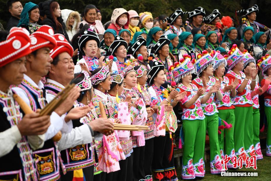 3月12日,正在表演的少数民族民众。天峰山歌会当日在大理州祥云县启幕。据了解,天峰山歌会自明朝年间就在民间兴起,每年农历二月十五便会举办。此次歌会吸引了来自大理州、楚雄州3个县区的3万民众参加。汉族、彝族、傈僳族、白族等少数民族的民众身着节日盛装,齐聚一堂,唱歌、跳舞、对唱山歌。中新社发 骆忠华 摄