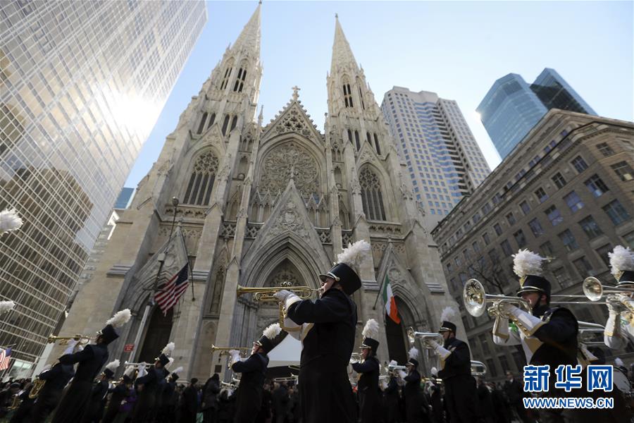 3月17日,在美国纽约曼哈顿,圣帕特里克节的游行队伍从圣帕特里克大教堂前经过。当天,第256届圣帕特里克节大游行在美国纽约第五大道举行,吸引数万人观看。每年3月17日的圣帕特里克节是爱尔兰传统节日,为纪念爱尔兰守护神圣帕特里克而设立。美国的爱尔兰后裔在这一天喜欢佩戴三叶草,用爱尔兰国旗颜色黄绿两色装饰房间,身穿绿色衣服,并向宾客赠送三叶草饰物等。新华社记者王迎 摄