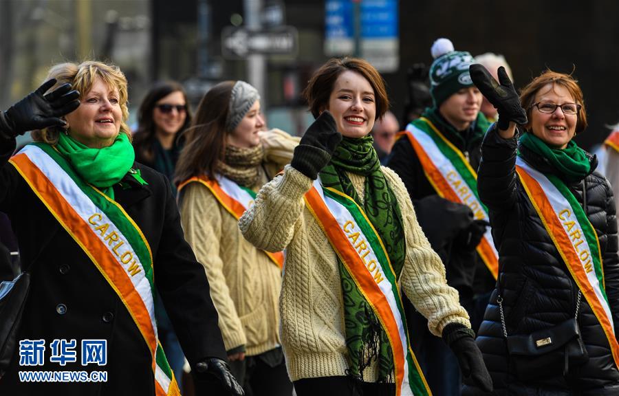 3月17日,在美国纽约,参加圣帕特里克节游行的队伍从第五大道走过。第256届圣帕特里克节大游行17日在美国纽约第五大道举行。每年3月17日的圣帕特里克节是爱尔兰传统节日,为纪念爱尔兰守护神圣帕特里克而设立。美国的爱尔兰裔在这一天喜欢佩戴三叶草,用爱尔兰国旗颜色黄绿两色装饰房间,身穿绿色衣服,并向宾客赠送三叶草饰物。新华社记者李睿摄