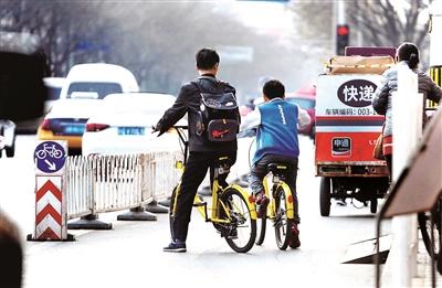 3月17日下午3点半至5点半之间,北青报记者在学院路上看到,附近多所小学放学后,不少家长骑上共享单车去接孩子。接到孩子后,少数人为了满足孩子骑自行车的愿望,把共享单车交给孩子骑,自己步行跟随;还有家长另外开一辆车,与孩子一起骑上车离开。