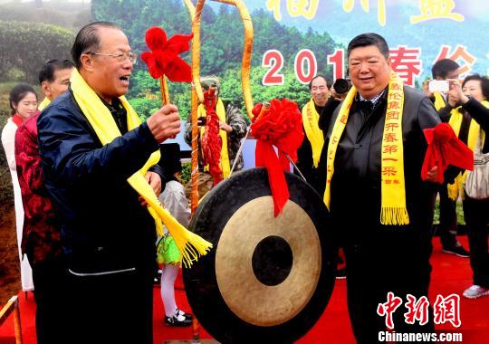 海峡两岸茶业交流协会创会会长张家坤(左一),福州海峡茶业交流协会会长吴依殿(右一)共同敲锣开春。 记者刘可耕 摄