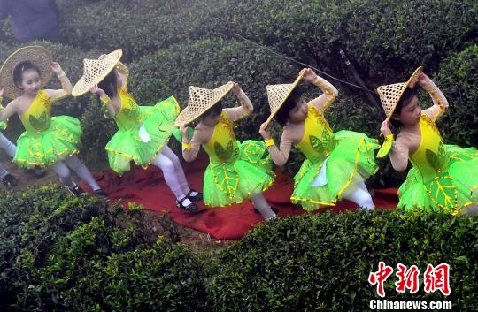 五位小姑娘茶园跳起采茶舞。 记者刘可耕 摄