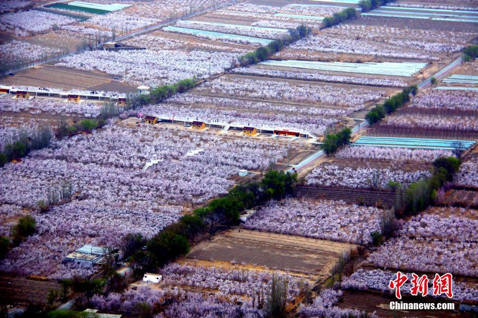 3月20日,摄影师乘坐动力三角翼飞跃新疆托克逊县万亩杏园,在500米高空用相机记录下万亩杏园盛开的壮观美景。动力三角翼缓缓升起,一大片花海映入眼帘,人群被“埋”在花海之中,可谓是不飞天不知万亩杏花之壮美。李靖海 摄