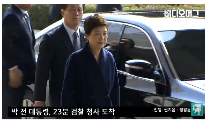 上午9时15分,随着朴槿惠私宅黑色厚重大门开启,像往常一样盘着头、身着蓝色正装的朴槿惠一走出家门,立即迎来手持太极旗民众“朴总统挺住”“朴总统加油”的欢呼。这也是朴槿惠自12日从青瓦台搬入这里后首次走出家门。当一位记者高喊,“请向支持者们说句话”时,朴槿惠仿佛未听到似的,只是用目光轻轻扫了一下支持的民众,并与警卫人员低语了几句,就直接钻进了黑色现代雅科仕专用座驾内。