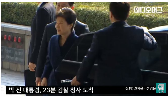 很快,朴槿惠乘坐的专车在警车开道和12辆警方摩托的护卫下沿德黑兰路开始向首尔中央地方检察厅进发。当车队来到地方检察厅大门口时,街道两旁分别站满了“挺朴”和“反朴”的人群。据韩国KBS电视台报道,一方市民高喊“立即拘捕朴槿惠”,另一部分示威者则在附近不到100米的距离高喊“弹劾无效,清除亲朝势力”等口号,双方呈现紧张对峙局面。警方当天在附近投入24个中队警力,以防止不测事件发生。
