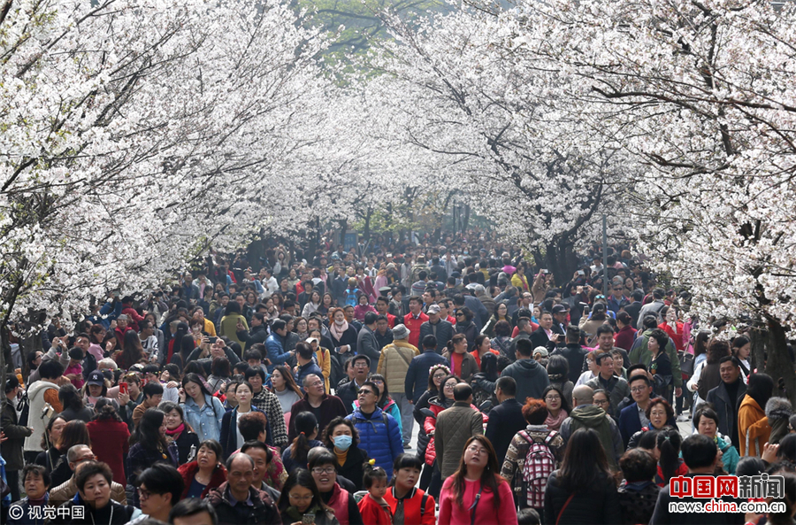 2017年3月21日,南京雨过天晴,市民和游人纷纷涌向南京鸡鸣寺路长402米的“樱花大道”,观赏这里盛开的樱花。南京鸡鸣寺路的“樱花大道”以早樱居多,每年最早一批樱花一般3月初就绽开了,盛放期从3月中旬一直延续至3月底4月初。王新/视觉中国