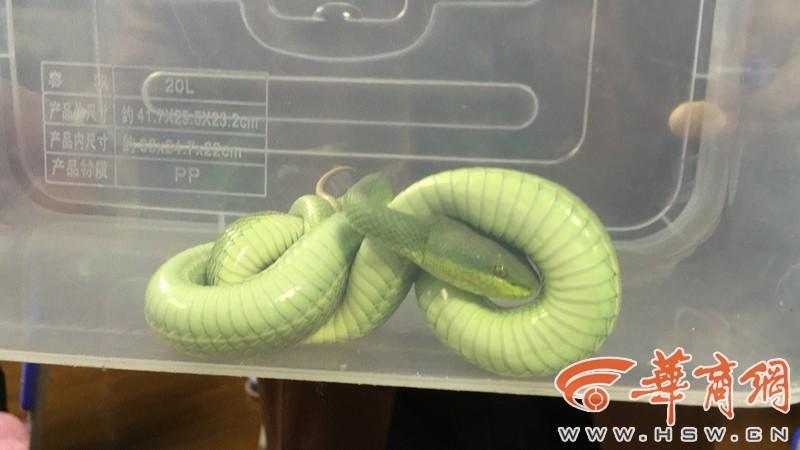 “我仔细一看,真是条绿色蛇,就问了卖花儿的。”3月21日晚,在店里,魏胜强指着放在塑料盒子里的蛇说就是它。盒子里的蛇,长约40厘米,头是三角形,尾巴呈红色,满身绿,肚子又是黄白色,一会慢悠悠扭着身子,一会懒洋洋蜷着睡觉。华商记者 曾春 摄 图片来源:华商网
