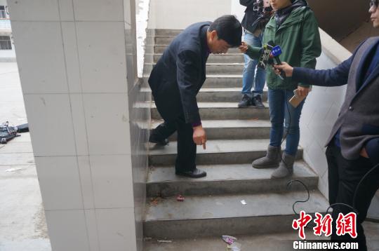学校副校长刘文华在事发现场向记者讲述事发经过。 韩章云摄