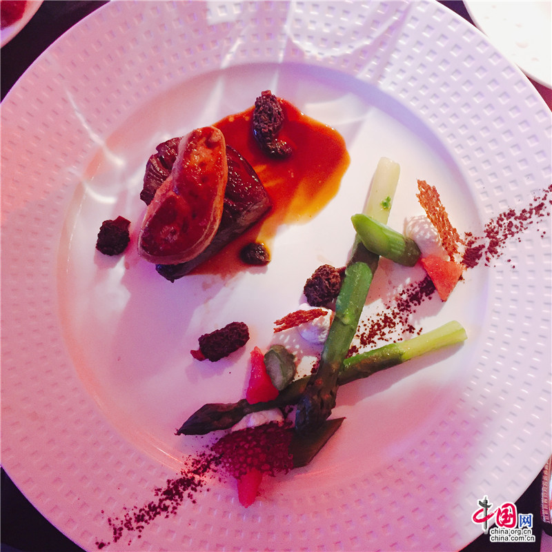 晚宴主菜:夏洛来菲力牛排配“露杰”鹅肝和绿笋。 摄影 中国网记者 赵丽莎