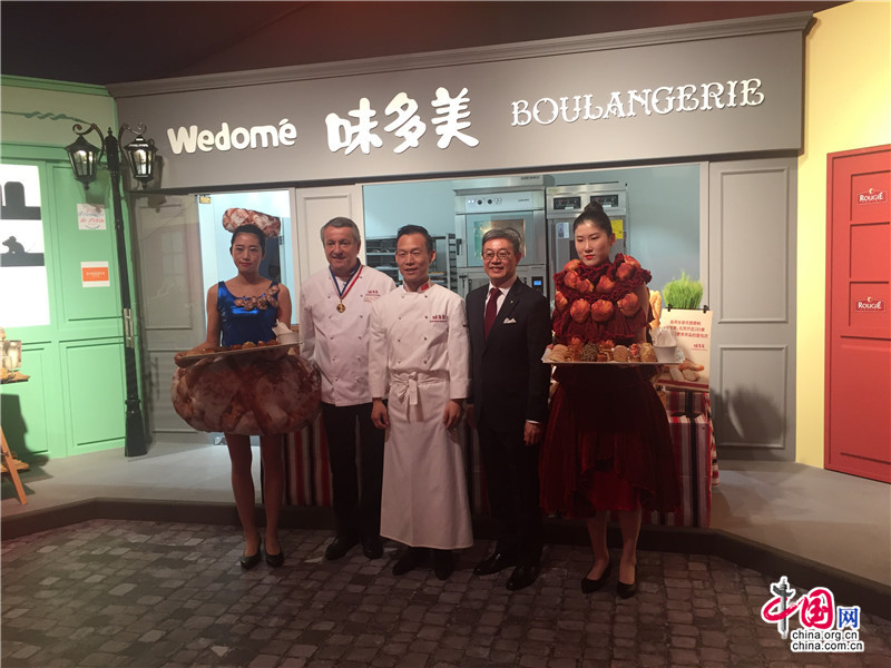 味多美董事长黄利(中间)与味多美全球研发总监克里斯蒂安•瓦布雷(Christian Vabret)(左二)在味多美面包摊位前合影。摄影 中国网记者 赵丽莎
