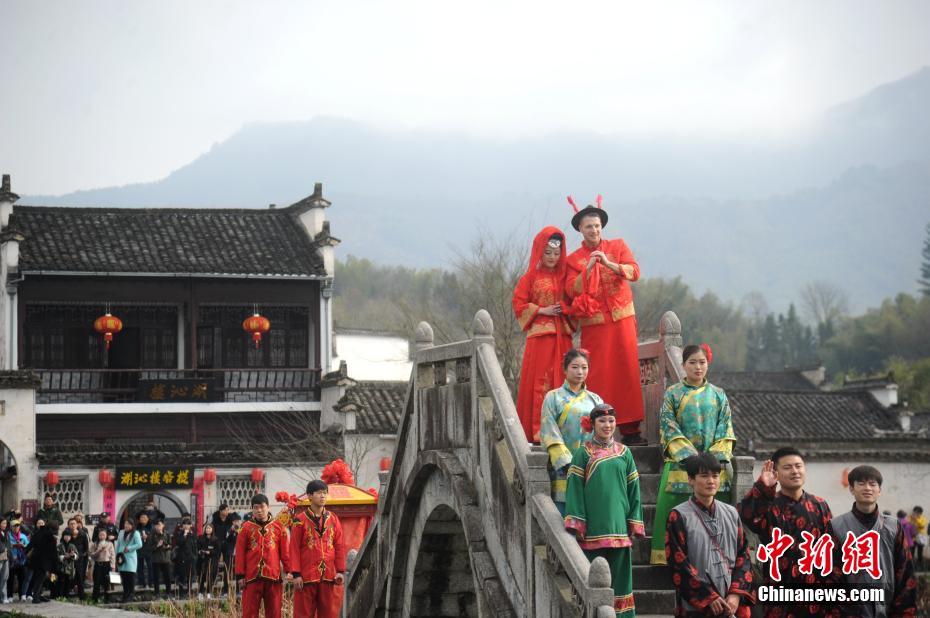 乌克兰“新郎”牵着中国“新娘”给游客行礼。 中新社记者 张娅子摄