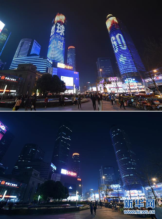 这是江苏省南京市新街口熄灯前(上图)和熄灯后(下图)的拼版照片(3月25日摄)。